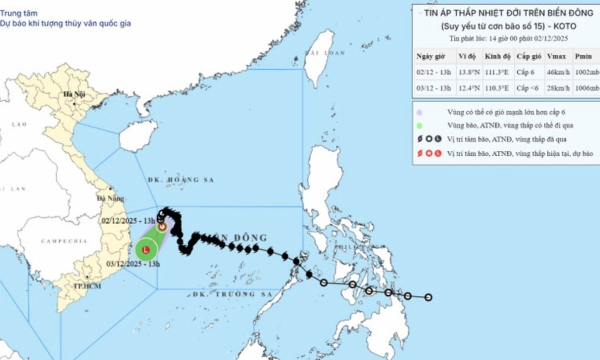 Lúc 13 giờ ngày 2/12, vị trí tâm áp thấp nhiệt đới ở vào khoảng 13,8 độ Vĩ Bắc; 111,3 độ Kinh Đông, trên vùng biển phía Tây Bắc khu vực giữa Biển Đông.