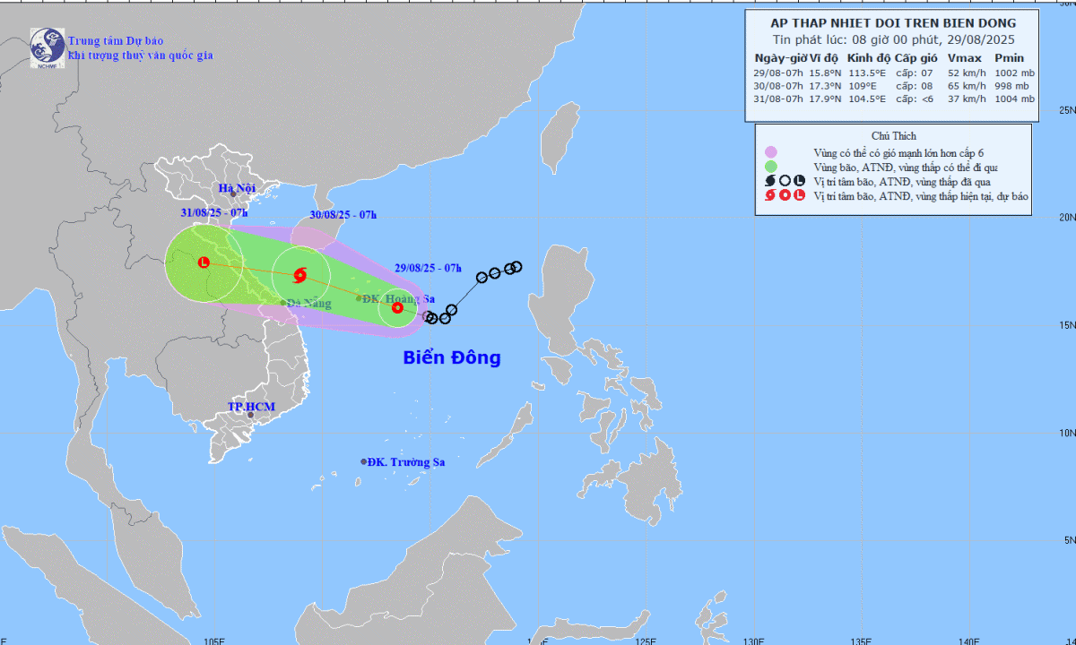 Dự báo đến sáng 30/8, áp thấp nhiệt đới sẽ mạnh thêm, di chuyển theo hướng Tây Tây Bắc với vận tốc 20 km/giờ, tiến gần vùng biển từ Nghệ An đến Thừa Thiên Huế. Đến sáng 31/8, tâm áp thấp nhiệt đới được dự báo ở trên khu vực Trung Lào, với vận tốc di chuyển tăng lên 20-25 km/giờ.