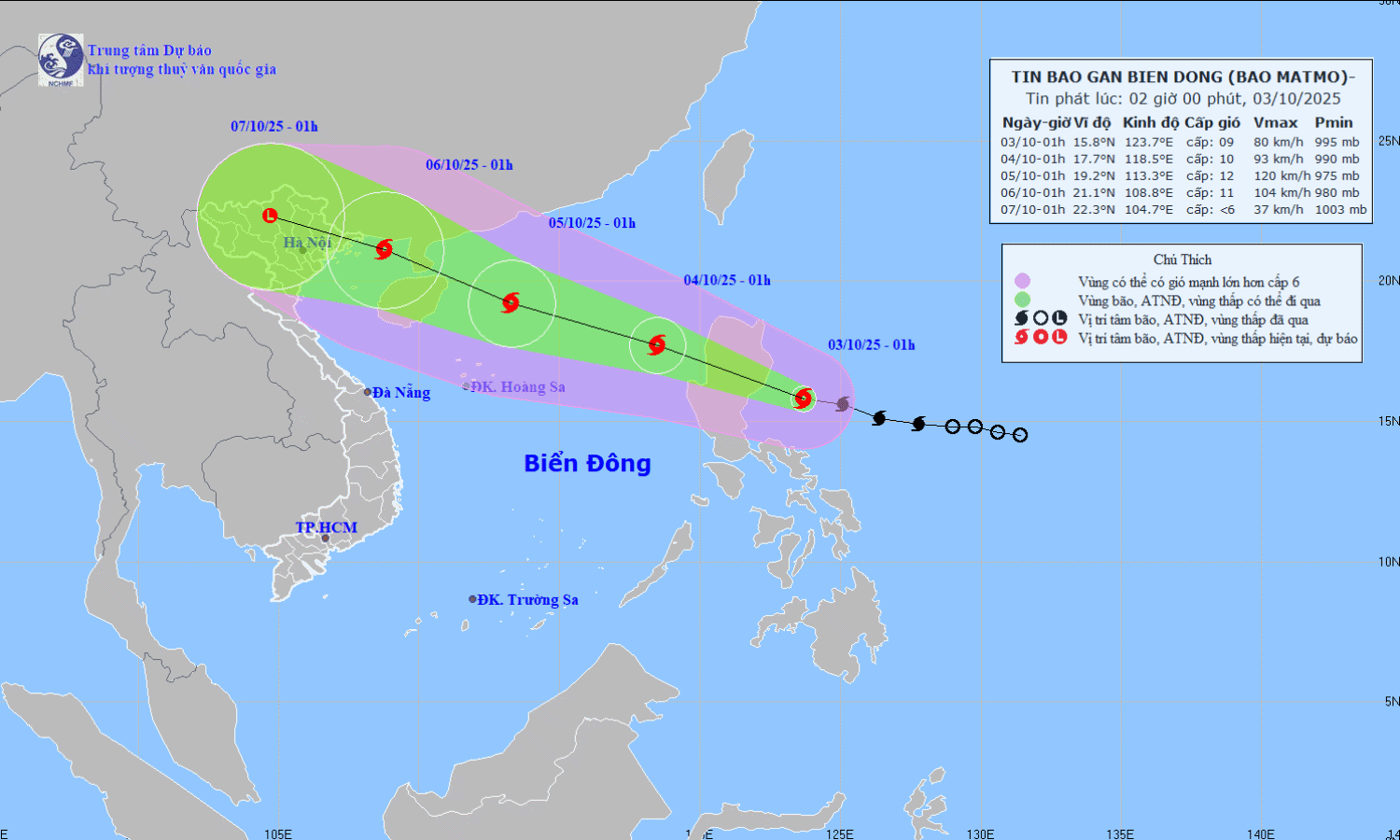 Dự báo đến 1h sáng 5/10, tâm bão Matmo nằm ở vùng biển phía tây bắc Bắc Biển Đông, cách bán đảo Lôi Châu (Trung Quốc) khoảng 340 km về phía đông đông nam. Lúc này, bão mạnh cấp 12 (118-133km/h), giật cấp 15.