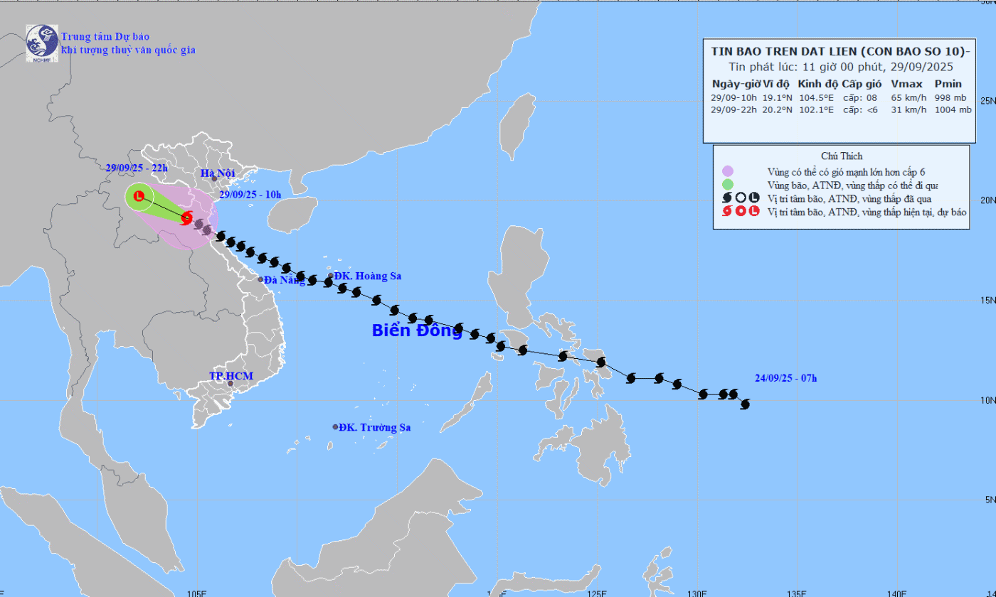 Trưa 29/9, Cục trưởng Cục Khí tượng Thủy văn Nguyễn Thượng Hiền cho biết bão số 10 đã đổ bộ vào đất liền nhưng nguy cơ mưa lớn, lũ, lũ quét và sạt lở đất vẫn hiện hữu có thể kéo dài đến hết ngày 1/10.