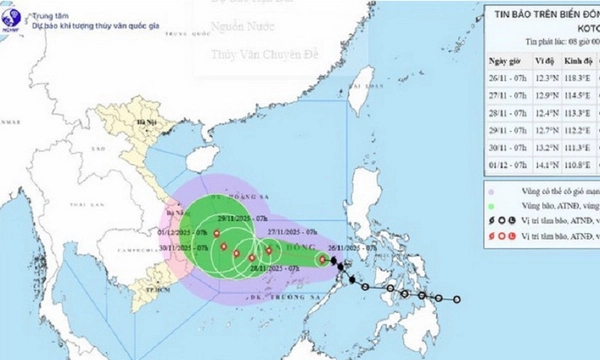 Dự báo đến sáng 27/11, bão sẽ ở gần khu vực giữa Biển Đông, cách Song Tử Tây khoảng 170 km về phía Bắc và mạnh lên cấp 10, giật cấp 13. Ngày 28–29/11, bão tiếp tục di chuyển chậm theo hướng Tây Tây Nam và Tây Tây Bắc, duy trì cường độ mạnh cấp 11, giật cấp 14. Toàn bộ vùng giữa Biển Đông, gồm cả khu vực phía Bắc quần đảo Trường Sa, sẽ có gió mạnh cấp 6–7, vùng gần tâm bão cấp 8–10, sóng cao 4–8 m, biển động rất mạnh. Cấp độ rủi ro thiên tai: cấp 3.