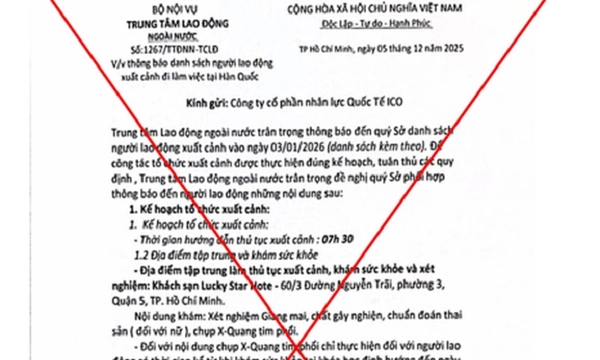 Theo thông tin từ Trung tâm Lao động ngoài nước, gần đây xuất hiện đối tượng lừa đảo gửi thông báo “xuất cảnh” giả mạo chữ ký của Thứ trưởng Bộ Nội vụ Nguyễn Mạnh Khương và con dấu của Bộ Nội vụ, yêu cầu người lao động nộp các khoản phí như tiền vé máy bay 690 USD, tiền trang phục 450.000 đồng, phí soi chiếu an ninh sân bay 59 USD và các phí dịch vụ khác tại sân bay quốc tế Tân Sơn Nhất.