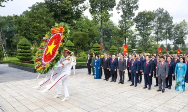 Bí thư Thành Ủy TPHCM Trần Lưu Quang cùng Thường trực, Ban Thường vụ Thành ủy TPHCM dẫn đầu đoàn. Vòng hòa của đoàn mang dòng chữ "Đoàn đại biểu dự Đại hội Đảng bộ TPHCM lần thứ I, nhiệm kỳ 2025 - 2030 kính viếng".