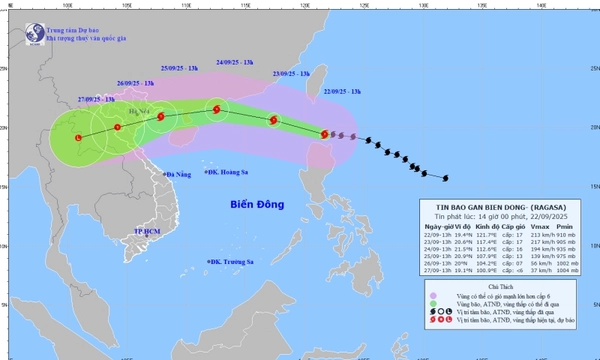 Dự báo trong 24 giờ tới, siêu bão Ragasa tiếp tục di chuyển theo hướng Tây Tây Bắc với tốc độ 20-25 km/giờ và đi vào Biển Đông. Đến 13 giờ ngày 23/9, vị trí tâm bão ở khoảng 20,6 độ vĩ Bắc – 117,4 độ kinh Đông, trên vùng biển phía Đông Bắc khu vực Bắc Biển Đông. Cường độ bão duy trì cấp 17, giật trên cấp 17. Vùng nguy hiểm là khu vực phía Bắc vĩ tuyến 18,0 độ Bắc, phía Đông kinh tuyến 115,0 độ Đông. Cấp độ rủi ro thiên tai được xác định ở mức 4, ảnh hưởng trực tiếp đến vùng biển phía Đông Bắc khu vực Bắc Biển Đông.