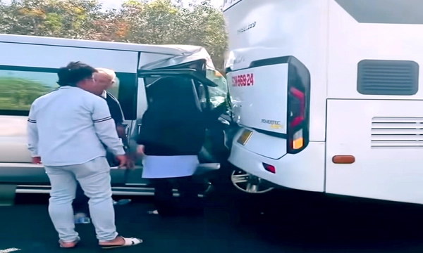 Xe 16 chỗ và 29 chỗ va chạm nhau trong vụ tai nạn liên hoàn trên cao tốc Phan Thiết - Dầu Giây, xảy ra chiều 4-1 - Ảnh cắt từ clip