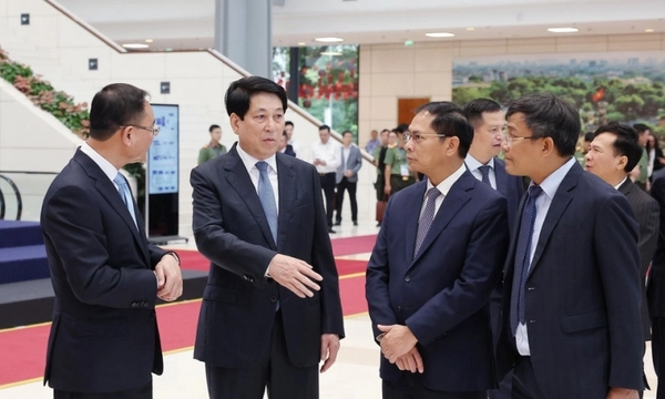 Chủ tịch nước Lương Cường đến kiểm tra công tác chuẩn bị và tổng duyệt Lễ mở ký Công ước Hà Nội tại Trung tâm Hội nghị Quốc gia (Mỹ Đình, Hà Nội) - Ảnh: TTXVN.
