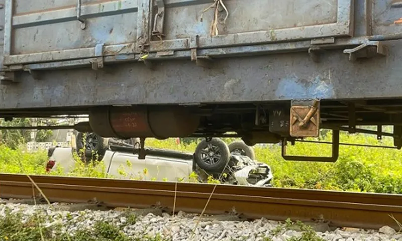 Đúng lúc đó, con tàu hàng mang số hiệu AH2 kéo theo 21 toa chạy tuyến TP HCM - Hà Nội chạy tới, tông trúng ôtô.