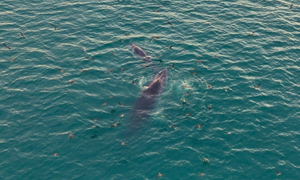 Khi cá voi săn mồi, đàn chim biển thường kéo đến bay lượn phía trên tạo nên một khung cảnh thiên nhiên sôi động, kỳ thú. Hiện tượng này được người dân địa phương gọi vui là “chim ăn ké cá voi” một hình ảnh đẹp về sự cộng sinh trong hệ sinh thái biển.