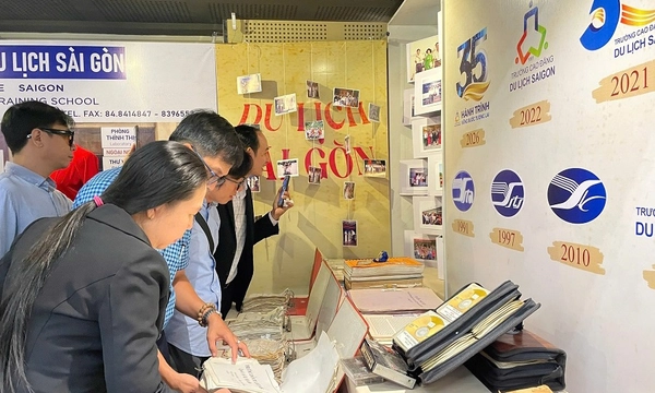 Bên lề sự kiện còn có không gian triển lãm “35 năm - Những lát cắt thời gian”. Ở đây, các đại biểu được tận mắt chứng kiến lại các hiện vật gắn liền với quá trình đào tạo các thế hệ sinh viên của nhà trường giai đoạn trước như: cuốn giáo trình đời đầu viết tay, Bộ thẻ hướng dẫn viên qua các thời kỳ và những kỷ vật từ những chuyến đi “khai phá” du lịch Việt Nam thập niên 90, những hiện vật gắn với Cố Hiệu trưởng nhà trường Nguyễn Thị Bội Quỳnh.