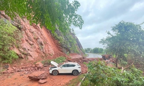 Hai chiếc ô tô, gồm một xe tải và một xe con, đã bị những tảng đá lớn rơi xuống đè trúng. Chiếc ô tô tải bị lật ngang đường, còn chiếc xe con bị hư hỏng nặng. Có 3 người trên xe tải và 5 người trên xe con đã bị thương nhẹ.
