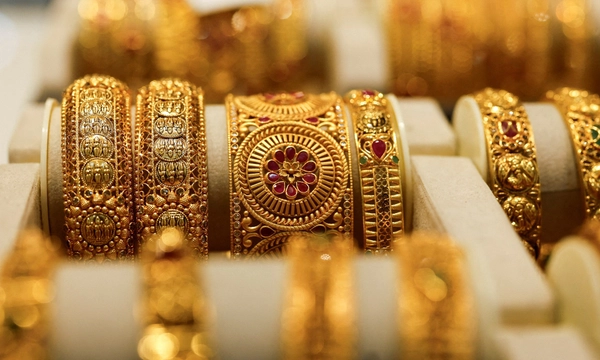 Những chiếc vòng tay vàng được trưng bày tại một cửa hàng trang sức ở Mumbai, Ấn Độ, ngày 20/3/2025 - Ảnh: Reuters