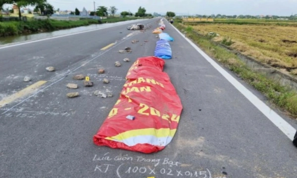 Theo điều tra, chiều 25/6, bà Mùi phơi lúa trên con đường mới trải nhựa, chưa thông xe, nối Quốc lộ 10 với tỉnh lộ 482. Bà dùng gạch, đá, bê tông chèn mép bạt để “báo hiệu” cho phương tiện qua lại.