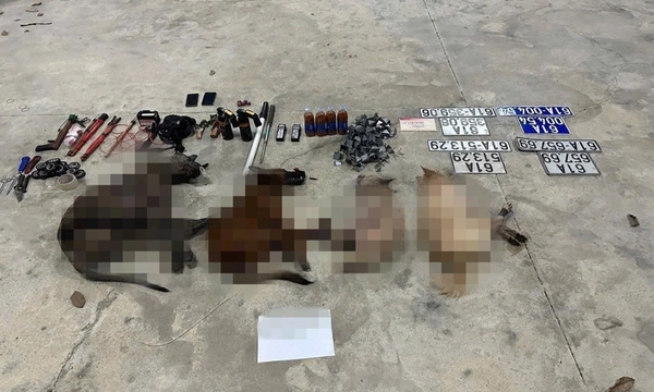 Kiểm tra chiếc xe, lực lượng công an phát hiện 4 con chó, cùng nhiều dụng cụ chuyên dụng để bắn chó, đinh tự chế rải đường, nhiều biển số ô tô khác nhau, trong đó có cả biển số xanh giả.