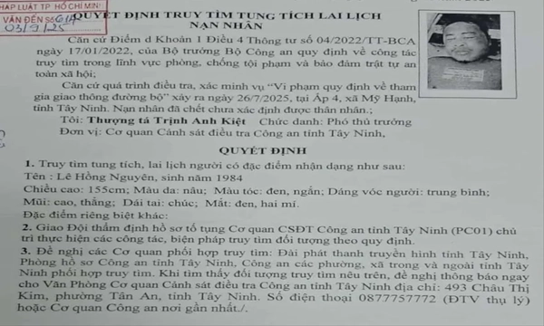 Cơ quan Cảnh sát điều tra (CSĐT) Công an tỉnh Tây Ninh vừa phát đi quyết định truy tìm tung tích và lai lịch một nạn nhân tử vong chưa xác định được danh tính.