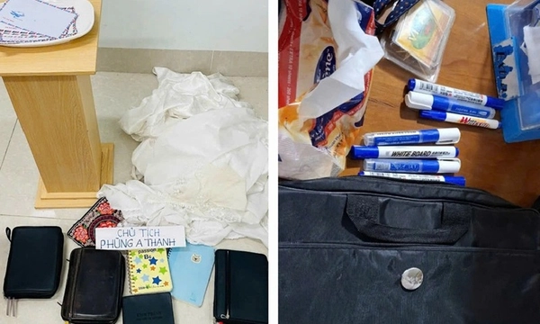 Tại hiện trường, công an thu giữ một số tài liệu, công cụ phục vụ sinh hoạt tôn giáo, gồm 1 bục bằng gỗ, khay lễ, 6 tài liệu liên quan đến hội thánh Đức Chúa trời mẹ, 7 khăn trắng.