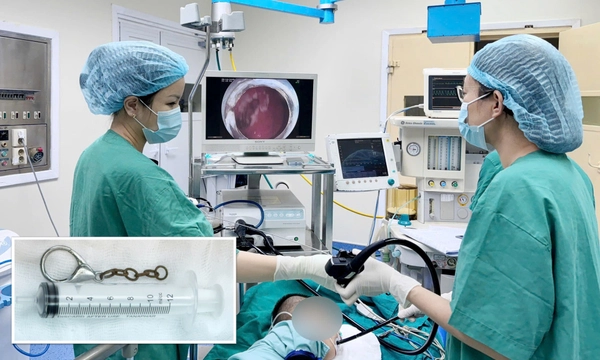 Bệnh nhi là bé trai (6 tuổi, trú tại Đông Triều, Quảng Ninh). Gia đình cho biết, trong lúc chơi đùa, bé cầm chiếc móc khóa và vô tình nuốt phải.