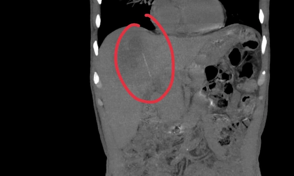 Khi tiến hành siêu âm kỹ hơn, ê kíp phát hiện một dị vật cản quang xuyên trong nhu mô gan, chiều dài ước tính khoảng 6-7cm. Ngay sau đó, bệnh nhân được chỉ định chụp cắt lớp vi tính (CT scan) ổ bụng.