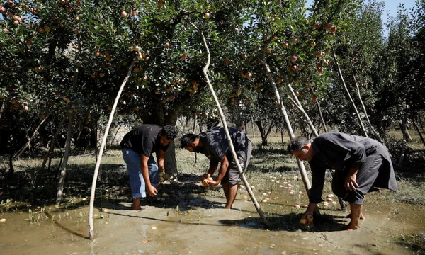 Tại khu vực Nam Kashmir, nước sông dâng cao tràn bờ, gây ngập úng vườn táo, cuốn trôi nhiều gốc cây và để lại những quả hư thối.