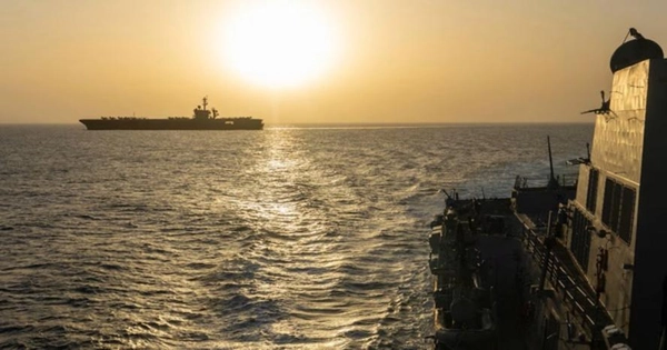 Tàu USS Abraham Lincoln của Mỹ làm nhiệm vụ phong tỏa các cảng của Iran ở biển Ả Rập, gần eo biển Hormuz, vào ngày 16/4 vừa qua - Ảnh: CENTCOM