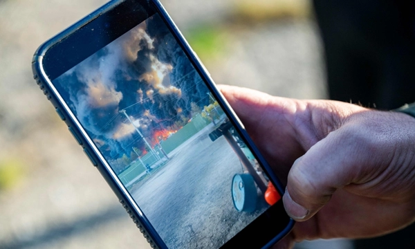 Một nhân viên của Kentucky Truck Parts and Services xem đoạn video quay bằng điện thoại sau khi máy bay chở hàng UPS MD-11 bị rơi vào ngày 4/11/2025 - Ảnh: Getty Images