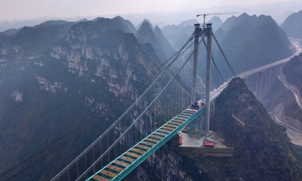 Cầu Huajiang Grand Canyon - bắc qua hẻm núi lớn Huajiang hùng vĩ - sắp hoàn thành việc xây dựng tại tỉnh Quý Châu, tây nam Trung Quốc.