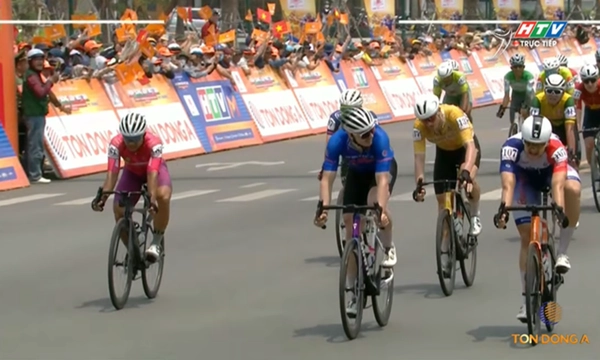 Tay đua Zachary Patterson (620 Nông nghiệp Vĩnh Long) giành chiến thắng sau màn nước rút “nghẹt thở” trước Marchuk Dzianis (Kenda Đồng Nai).