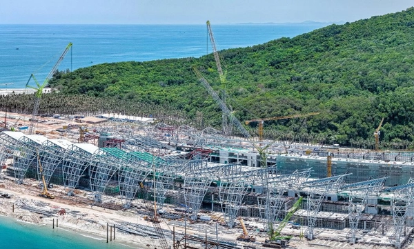 Trên công trường tại đảo Ngọc, tổ hợp hội nghị - triển lãm quy mô lớn đang dần thành hình. Nổi bật nhất là hệ mái thép lớn với các đường cong mô phỏng sóng biển, tạo dấu ấn kiến trúc cho toàn bộ công trình.