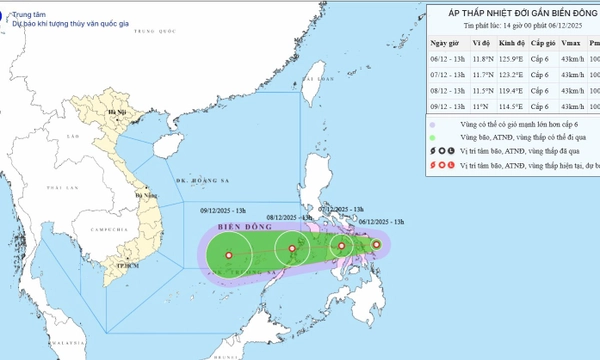Chiều 6/12, Trung tâm Dự báo Khí tượng thủy văn quốc gia phát bản tin đầu tiên về một áp thấp nhiệt đới đang hoạt động phía Đông miền Trung Philippines, có sức gió mạnh cấp 6, giật cấp 8.