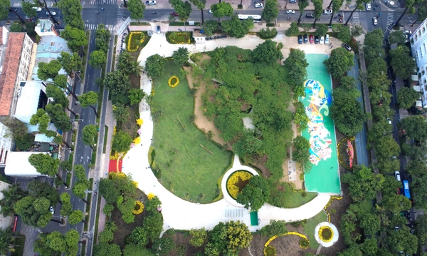 Toàn cảnh công viên Phan Đình Phùng nhìn từ trên cao, khu “đất vàng” giữa trung tâm TPHCM được cải tạo thành không gian xanh phục vụ cộng đồng. - Ảnh: Văn Phúc