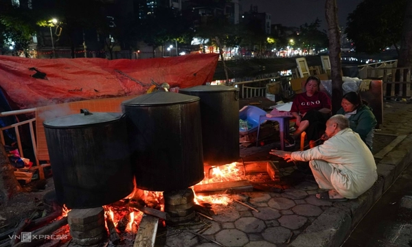 Khoảng 19h, gia đình bà Son bắc nồi trên vỉa hè sát sông Tô Lịch, quây bạt chắn gió và nhóm lửa.