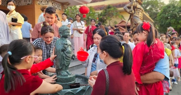 Nhiều Phật tử xếp hàng chờ thực hiện nghi thức tắm Phật. Đây không chỉ là hoạt động cầu bình an mà còn mang ý nghĩa gột rửa thân tâm, loại bỏ phiền não, tham sân si, hướng đến sự thanh tịnh và an lạc trong cuộc sống.