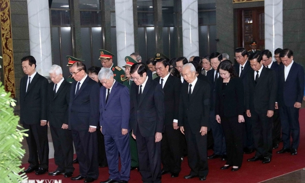 Tham gia đoàn viếng có nguyên Tổng Bí thư Nông Đức Mạnh, nguyên Chủ tịch Quốc hội Nguyễn Thị Kim Ngân, nguyên Chủ tịch nước Nguyễn Minh Triết, nguyên Chủ tịch nước Trương Tấn Sang, nguyên Thủ tướng Nguyễn Tấn Dũng...