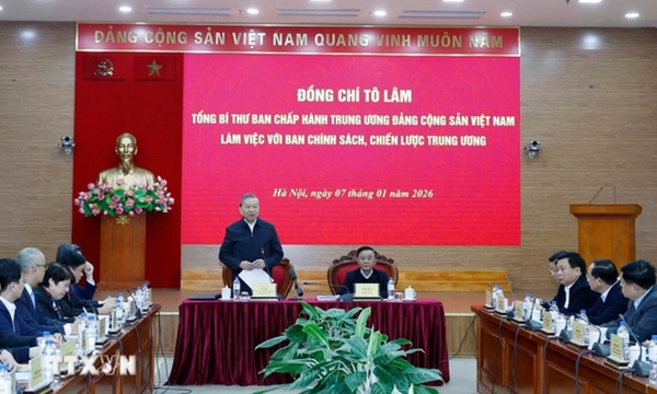 Tổng Bí thư đề nghị Ban Chính sách, chiến lược Trung ương cần chủ động nghiên cứu sâu lý luận và tổng kết thực tiễn, không ngại đổi mới tư duy, không né tránh vấn đề khó; huy động trí tuệ của đội ngũ chuyên gia, nhà khoa học trong và ngoài nước để tham mưu cho Trung ương những nội dung đột phá thực sự góp phần phát triển đất nước trong giai đoạn tới.