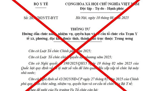 Theo Bộ Y tế, văn bản giả mạo mang số hiệu 2830/2025, đề ngày 10/8/2025, với tiêu đề "Thông tư hướng dẫn chức năng, nhiệm vụ, quyền hạn và cơ cấu tổ chức của Trạm Y tế xã, phường, đặc khu thuộc tỉnh, thành phố trực thuộc Trung ương".